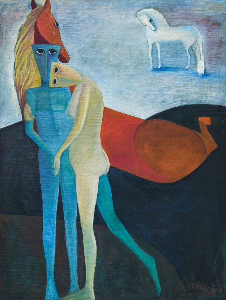 Morsi’s visual language tends to be exaggerated in its depiction of the human and animal figures. Their mask-like faces are in most instances flattened into angular elements.