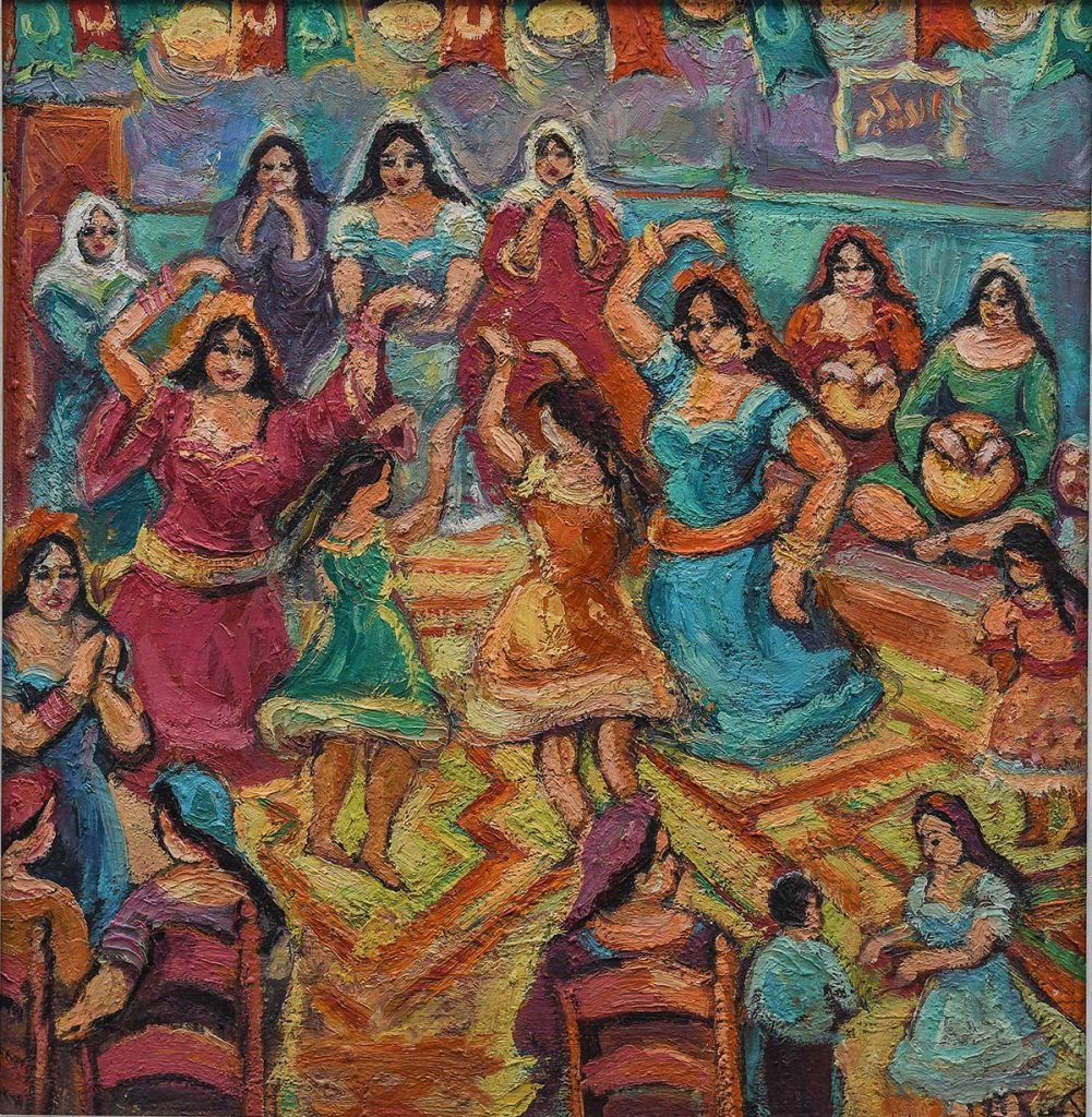 Women and children gathered in a room playing instruments, singing, and bellydancing. Festive rituals commonly practiced by the working class in Egypt.