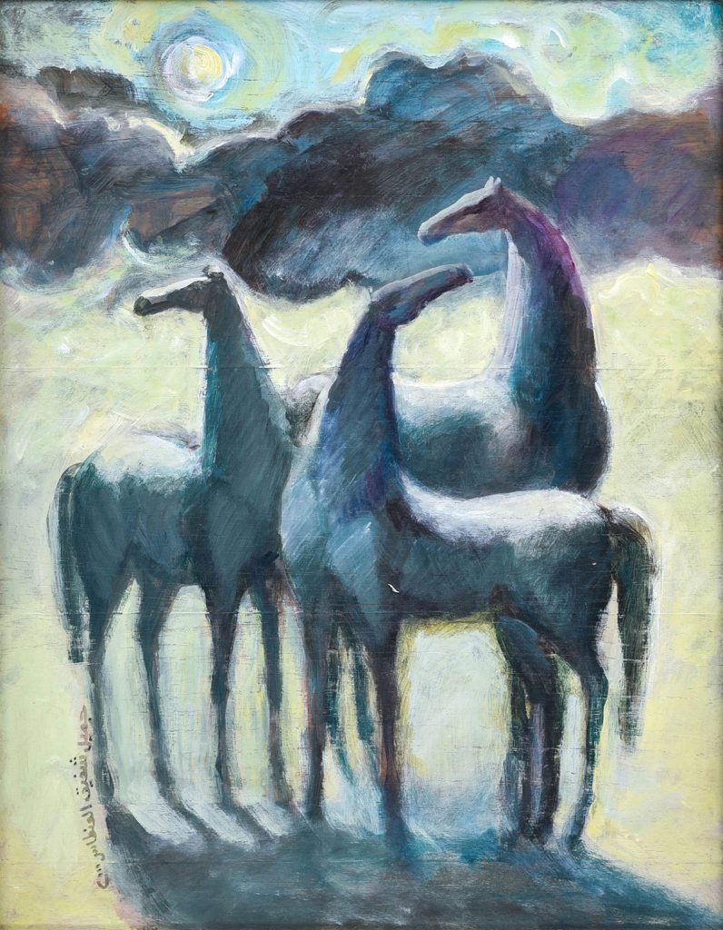 Using thick impressionist brush strokes, Shafik creates a natural green and blue landscape and standing in it, three horses gather together in the moonlight, expressing a positive and forceful energy.