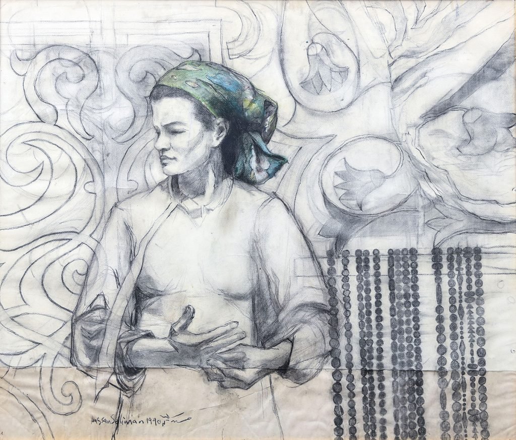 In addition to painting, Hassan Soliman experimented with graphic engraving and drawing where he was master. A woman with a head scarf stands in front of a wall with patterns.