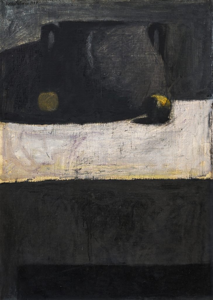 Still-life painting represented most of Hassan Soliman’s early collections. Dominated by black and dark shades of grey, this work is typical of his monochromatic paintings. Here Soliman fuses minute details to focus on the expressive whole.