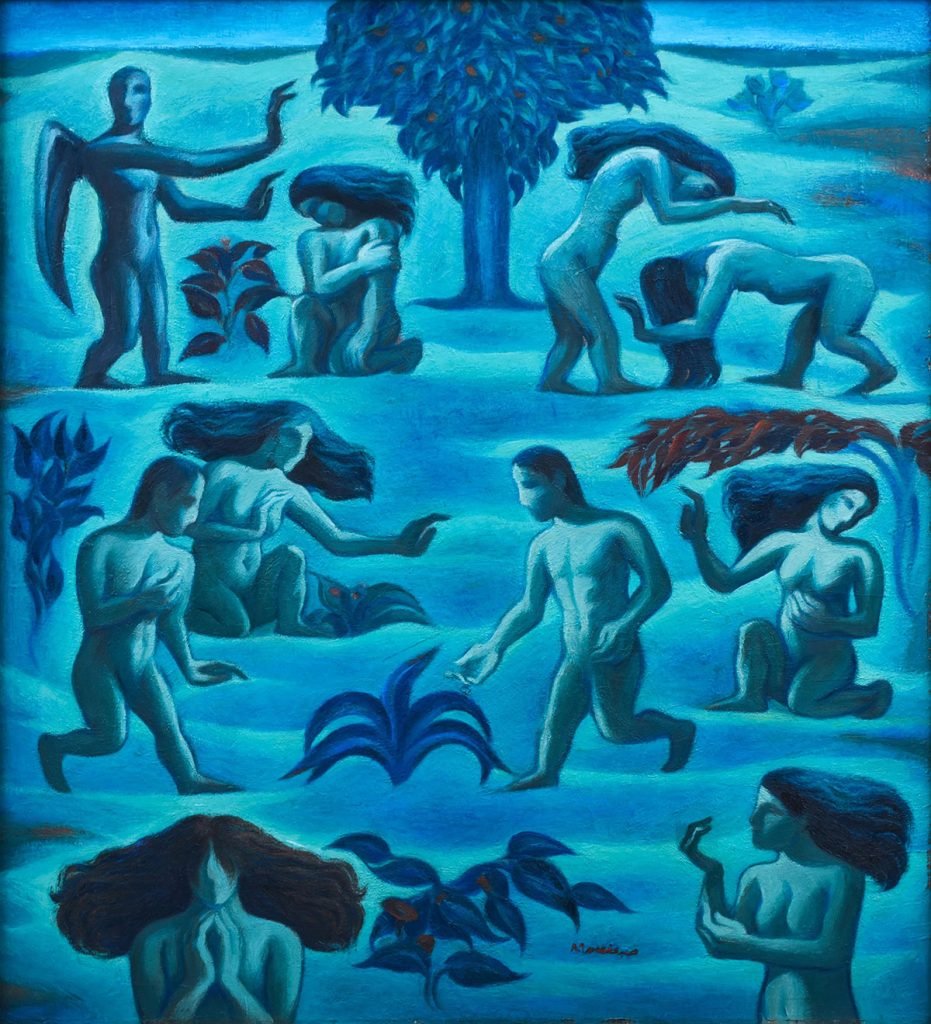 Like many of Sabri Mansour’s paintings in monochromatic blues, quiet moments of spiritual reverie are depicted surrounded by traditional religious symbols.