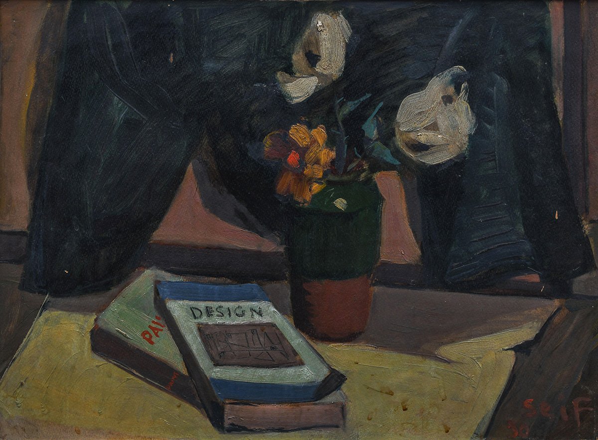 Still-life painting was a big part of Seif Wanly’s oeuvre early in his career. Using bold brush strokes, two books sit on a table in the shadow of a vase of flowers.